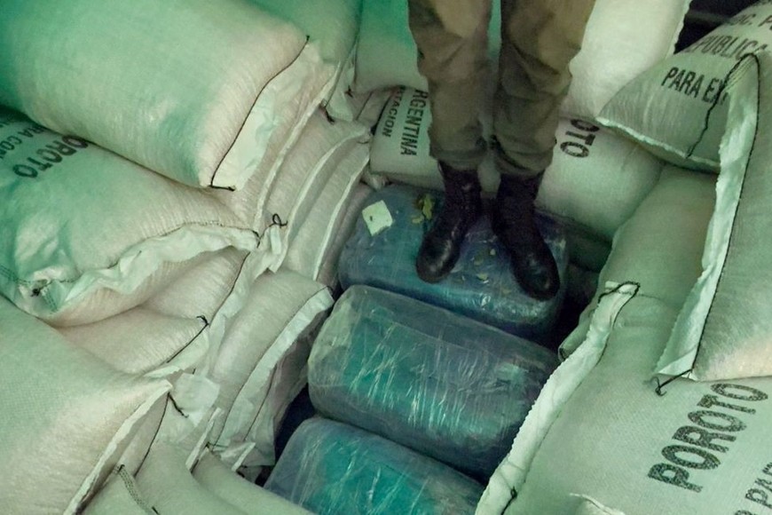 Al realizar la inspección del camión y el acoplado, los gendarmes hallaron 27 paquetes rectangulares con un total de 621 kilos de hoja de coca.