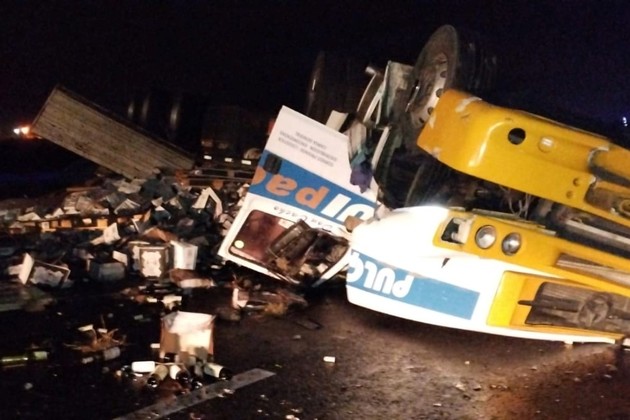 Personal de bomberos completaron las labores durante la madrugada y primeras horas de la mañana. Se corrió el camión hacia la banquina con una grúa y se prosiguió con la limpieza de los restos de la bebida alcohólica y el gasoil derramado.