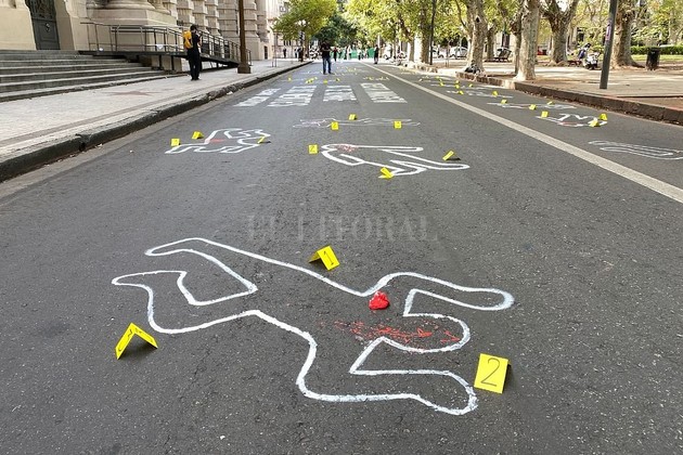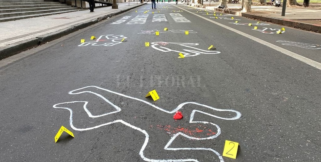 Este colectivo recreó sobre el asfalto de calle Santa Fe escenas de crímenes con pintadas de cuerpos contorneados en el suelo y balas un lado. Además pintó con letras blancas la frase: “Que esta imagen no se borre de sus mentes”.