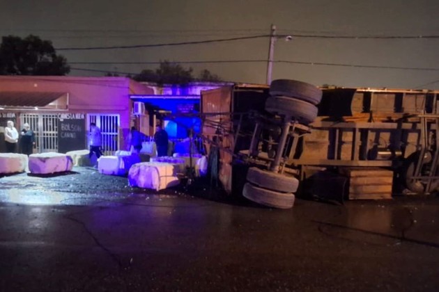 Un camión con acoplado que transportaba fardos de algodón perdió la estabilidad en plena curva y volcó parte de su carga. Los pesados bultos quedaron desparramados sobre la vereda y en un terreno lindero, provocando daños materiales en un comercio ubicado en la zona.