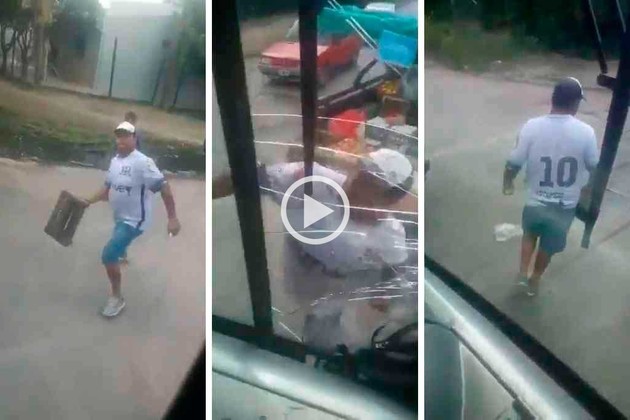 La secuencia continúa con este vendedor ofuscado esgrimiendo un cuchillo y tomando un cajón de madera con el que rompió los vidrios del transporte público.