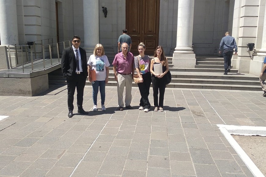 Los denunciantes ( Alicia Riveri, Gisela Maglianesi, Fernanda De Luca, Carlos Astorri y Franco Scali) frente a las puertas de la Legislatura provincial.