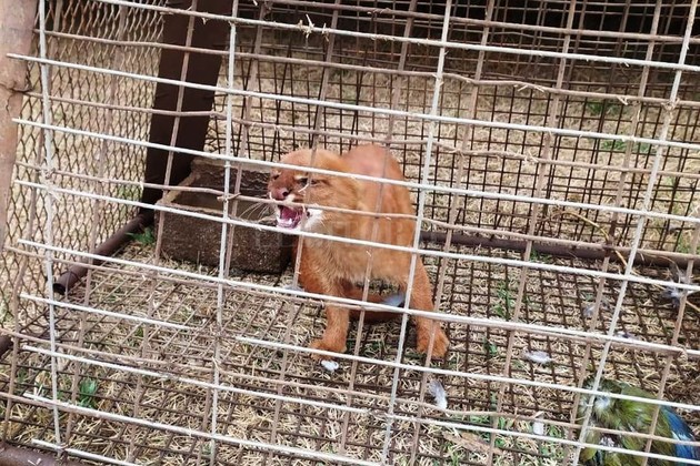 El dueño del hogar, para evitar una pelea contra sus perros, encerró al gato en una jaula.