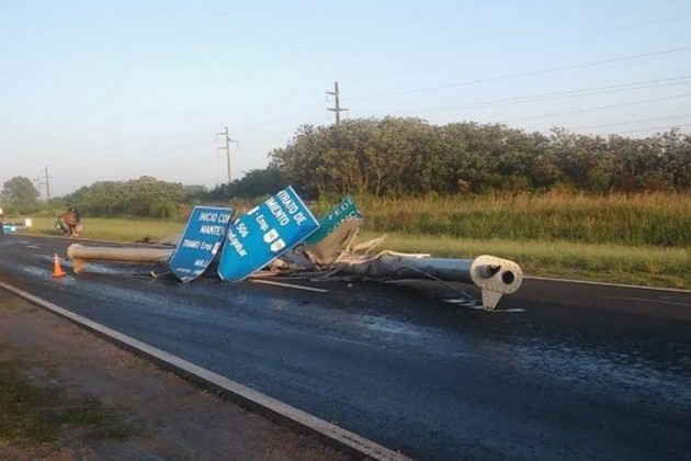En el mismo instante, en mano contraria circulaba un automóvil Chevrolet Prisma, con tres ocupantes, quienes colisionaron el cartel y terminaron a un costado de la calzada pavimentada.