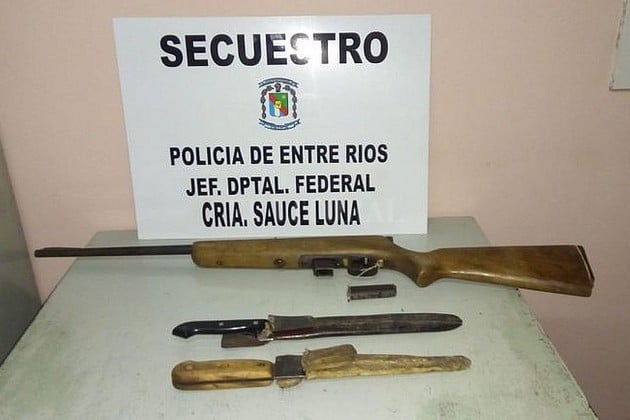 Asimismo, los investigadores también hallaron el arma que habría sido utilizada para cometer el delito. Se trata de carabina calibre .22 marca "Halcón" y dos cuchillos con restos de carne y sangre.