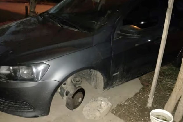 Este sábado a las 6 de la mañana, cuando se levantó para viajar a celebrar el cumpleaños de una sobrina, se encontró con que le faltaba una rueda de su auto que estaba estacionado frente a su domicilio en calle Juan B Justo al 1100.