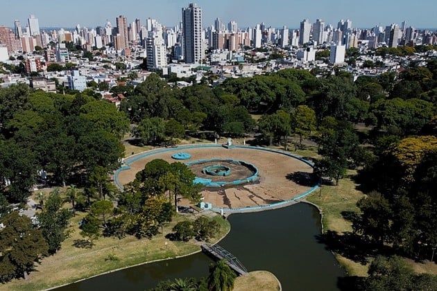 Apenas dos días después de que la Municipalidad anunciara la renovación del sistema de iluminación, delincuentes se robaron 68 luminarias LED, dejando a oscuras una parte del emblemático Parque Garay. Foto: Archivo / Luis Cetraro (dron).
