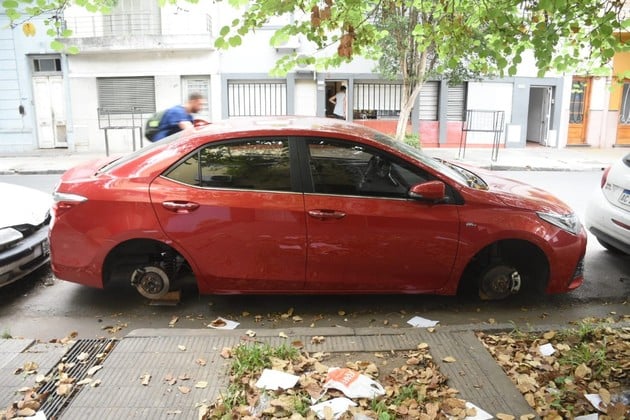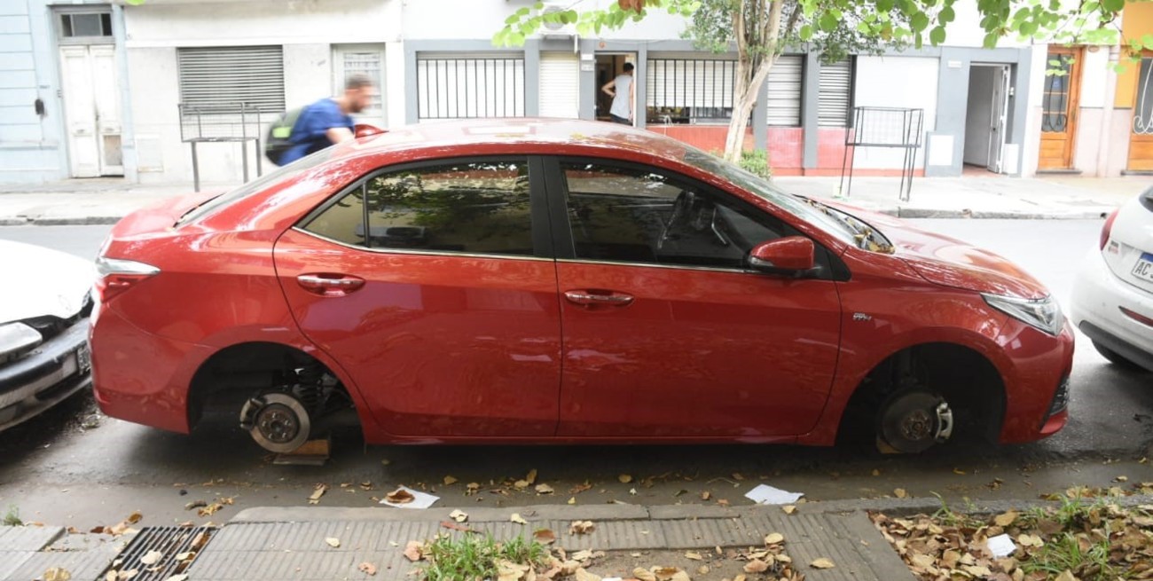 Con singular habilidad los "amigos de lo ajeno" en pocos minutos sustrajeron la dos ruedas del lado derecho (delantera y trasera) dejando el automóvil apoyado sobre dos "tacos" de madera.