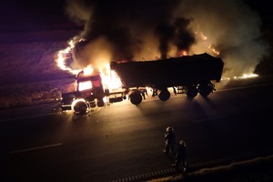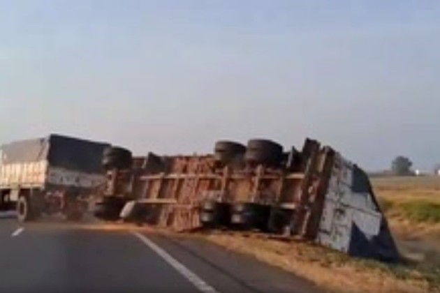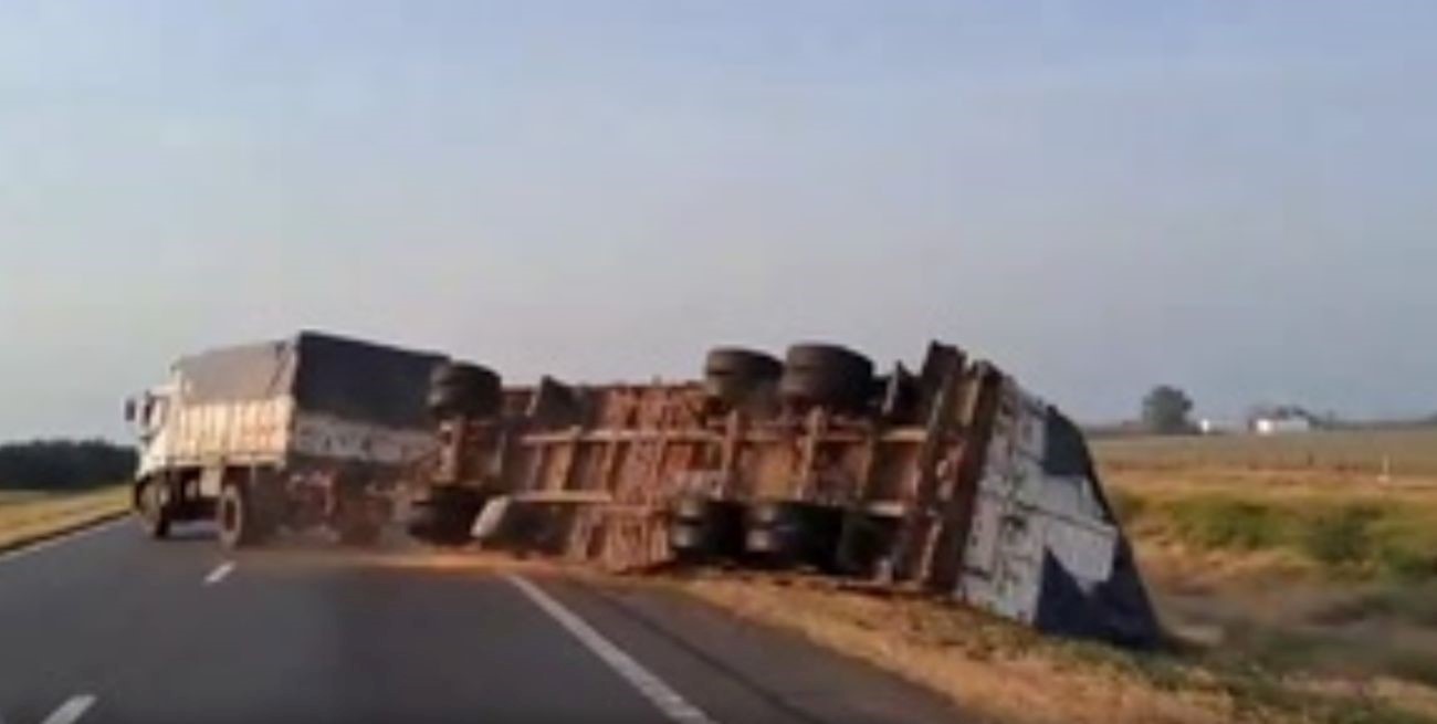 Seguidamente dan la orden de detención del camión a su conductor, en reiteradas ocasiones, sin embargo éste no acata las indicaciones y continúa la marcha hasta que pierde el control del vehículo y produce el vuelco del acoplado, derramando parte de la carga y obstruyendo la totalidad de la calzada.
