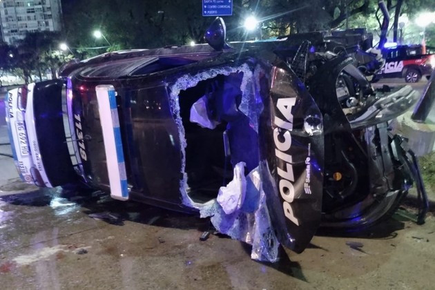 La persecución ganó velocidad en la avenida Alem, donde los conductores que circulaban a esa hora no podían creer lo que veían. Pero en plena esquina con San Luis, la tensión se transformó en drama: uno de los patrulleros perdió el dominio y terminó volcado sobre la calzada.