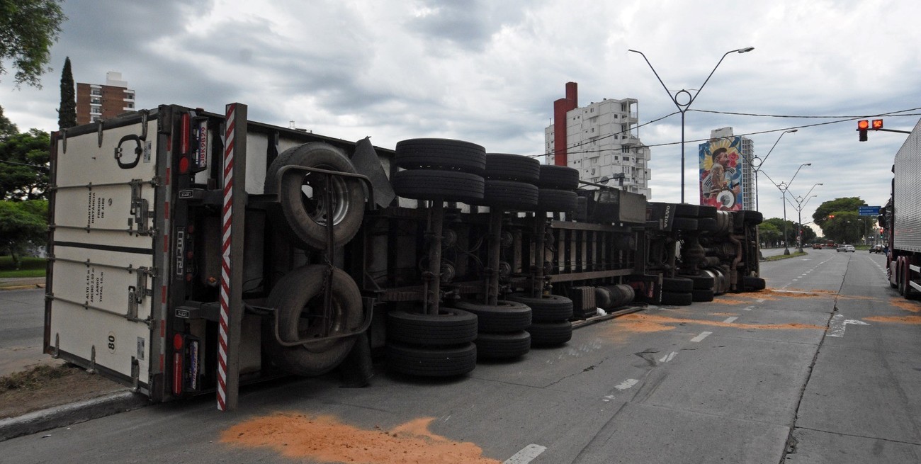 Los conductores santafesinos se toparon con una gran sorpresa este domingo cuando notaron en Avenida Alem la presencia de un camión volcado en la carpeta asfáltica.