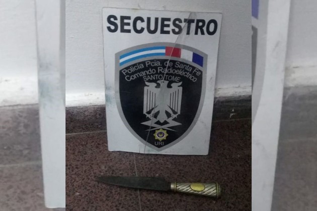 No tardaron en interceptarlo y al revisarle los bolsillos de la campera, descubrieron que en uno de ellos llevaba un cuchillo, del tipo facón, de mango de metal de color plateado y dorado y hoja de metal de 12 cm.