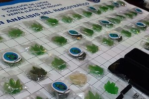 Allí fueron detenidos dos hombres que tenían en su poder una bolsa de papel madera con varios paquetes de caramelos masticables gelatinosos, de color verde y con forma de hojas de marihuana.