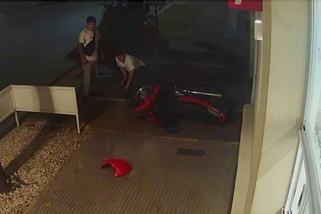 Las imágenes son claras. Un sujeto se acerca a una moto Motomel Blitz roja de 110 centímetros cúbicos estacionada frente al local, la retira a la rastra para alejarla y luego violenta la parte de la traba y el arranque para poder encenderla. La fiscal del caso, Rosana Marcolín, sostiene que se trataba de Alan Fernández.