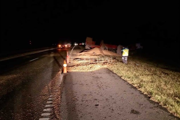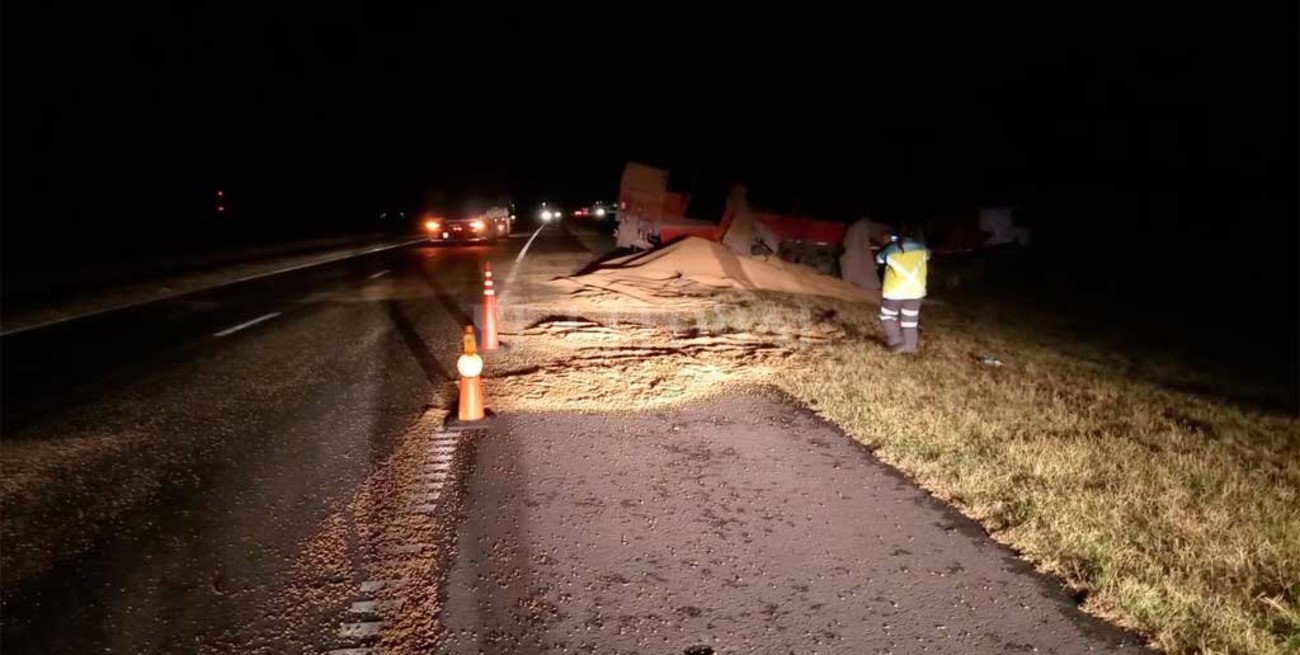 Se trató de un camión modelo Axor, Mercedes Benz con semirremolque, cargado con soja, el que por causas que se tratan de establecer, escapó al dominio de su chofer, salió de la cinta asfáltica y terminó volcando su carga en la banquina.
