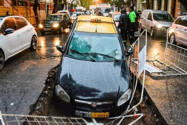 Este jueves, a primera hora de la mañana, un taxista no logró esquivar un corralito de Aguas Santafesinas ubicado en la esquina de San Juan y Alvear de la ciudad de Rosario. la cual amaneció atacada por la intensa lluvia.