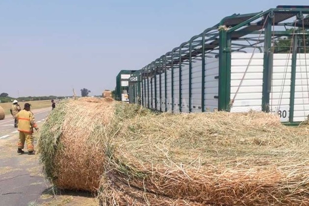 Fuentes policiales indicaron a El Litoral que el penoso hecho ocurrió en el km 61 de la Autovía 19 cuando un camión cargado con pasturas volcó su carga sobre el pavimento y la banquina.