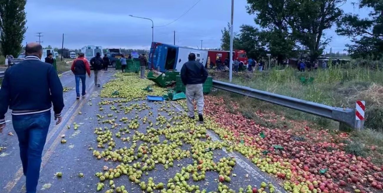El hecho se produjo a unos 20 km del Puente Colorado, luego de que parte de la carga de peras y manzanas comenzará a caer e impactara contra el parabrisas del colectivo, que terminó chocando parte del semirremolque y volcando.