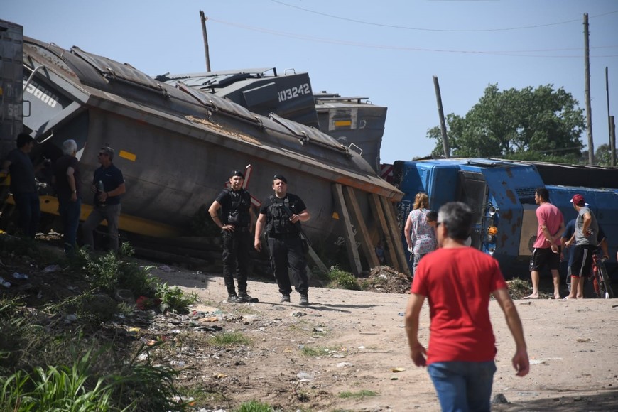 Personal policial realizó tareas de custodia para evitar el saqueo masivo del cargamento de los vagones (maíz y soja): Crédito: Flavio Raina
