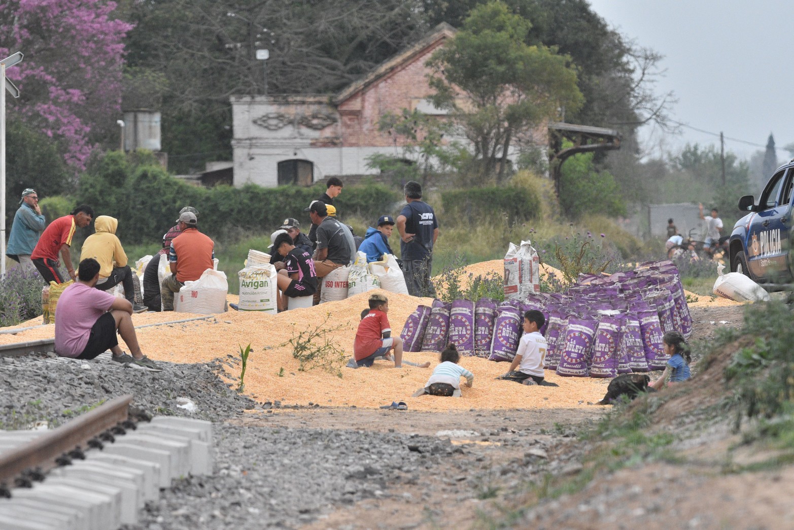 6 / 6 Vuelco de maíz en las vías del tren en barrio El Chaparral , la policía custodia la zona para evitar el robo Foto: Flavio Raina