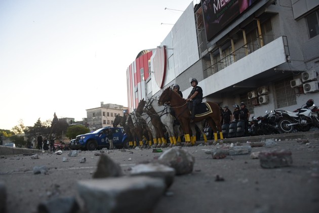 En tanto otro grupo salió hacia la zona de bulevar Pellegrini y la avenida López y Planes y comenzaron a arrojan piedras contra el frente de la sede y el personal policial que se encontraba parapetado en la puerta, con cascos, escudos y armas largas.