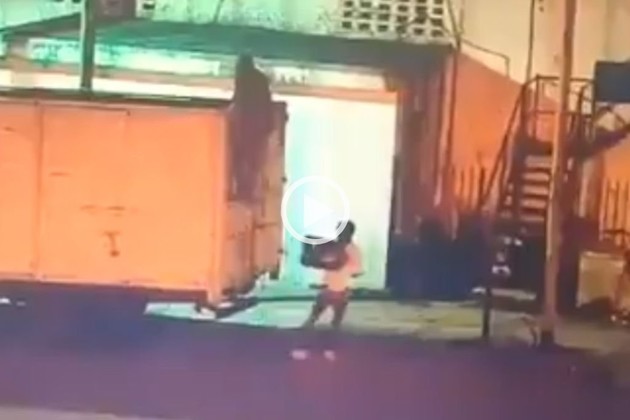 El video fue compartido por las cuentas oficiales de la fuerza policial. En el mismo se puede ver a los adolescentes esconder las cajas con botellas en un contenedor de basura, las cuales fueron tapadas con un colchón viejo.