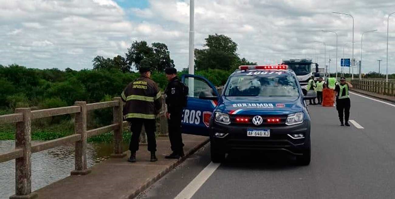 Buzos tácticos y Bomberos trabajan en el lugar en procura de lograr la extracción de un vehículo, que se estima sería un camión, sin ocupantes en su cabina. Distante a unos 20 metros, hay otra estructura que se presume podría ser la carga u otro vehículo.