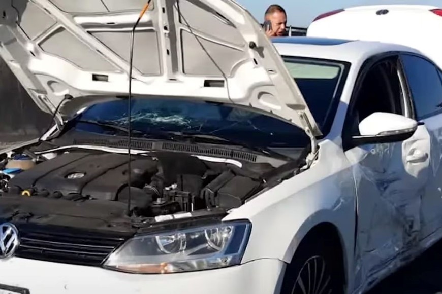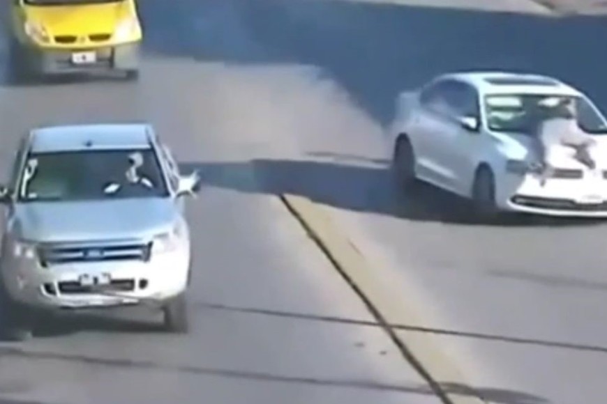 Luego de discutir por la colisión, uno de los conductores decidió escaparse y manejó durante varios kilómetros con uno de los damnificados sobre su vehículo.