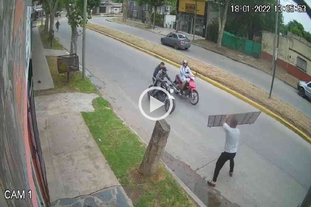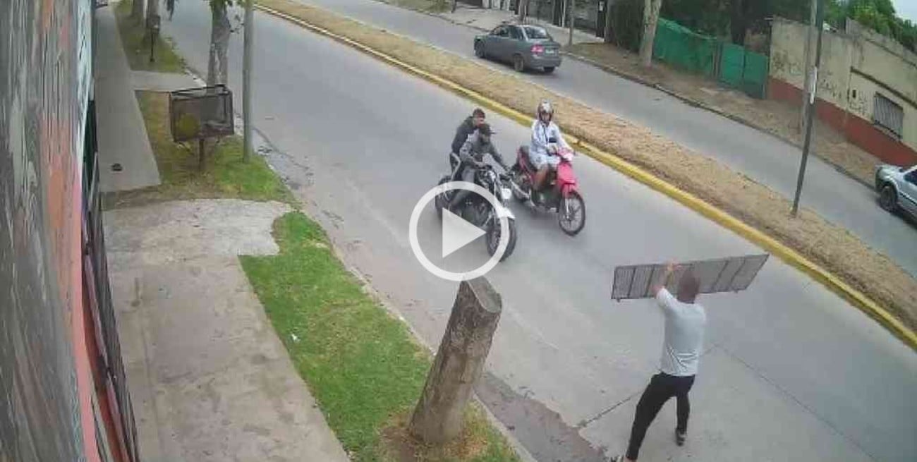 Un comerciante de San Vicente le arrojó una reja a dos delincuentes que huían en una moto robada y logró que el dueño pueda recuperar el vehículo. La secuencia quedó filmada por cámaras de seguridad de los comercios y se volvió viral en redes sociales. Los delincuentes huyeron.