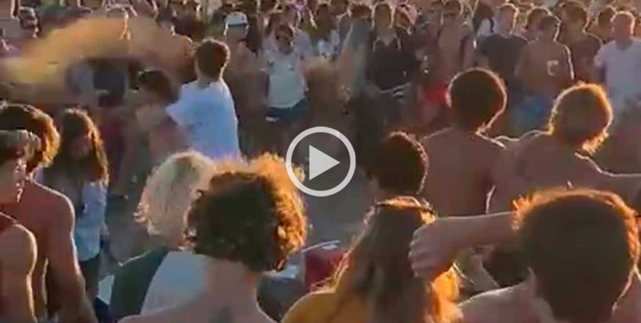 En un video que fue difundido en redes sociales se ve cómo una multitud se mezcla en un enfrentamiento, mientras atardece en la costa argentina.