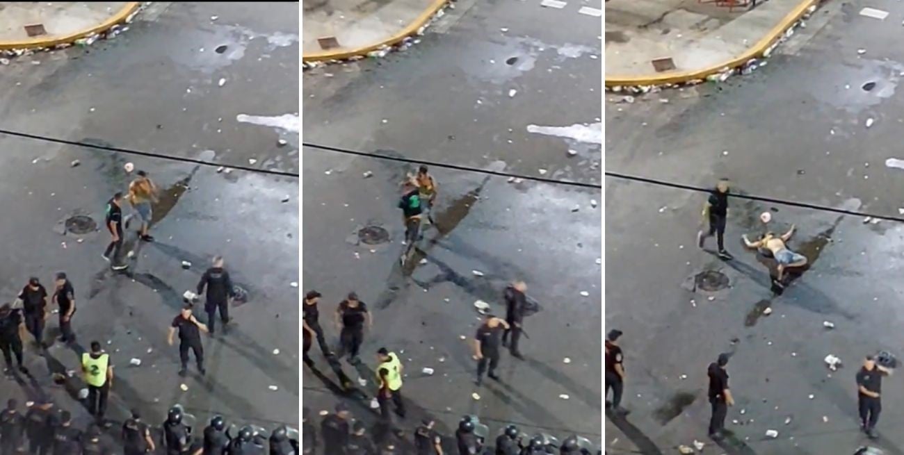A las afueras del estadio hubo corridas y algunos enfrentamientos entre la policía y los fans. En ese contexto, un personal de seguridad golpeó a un individuo y lo dejó tendido en el suelo sin reaccionar. Las imágenes captadas fueron subidas a las redes y se viralizaron rápidamente.