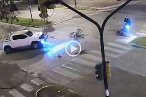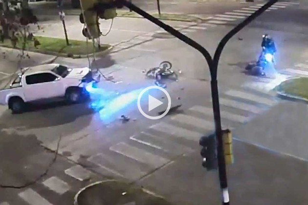 Un fuerte choque entre una camioneta y una moto quedó captado por las cámaras de seguridad de la ciudad de Rosario.