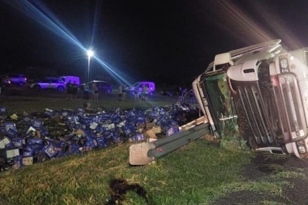 El camión, que provenía de Paraguay, transportaba un cargamento de cajas con botellas de una reconocida bebida, las cuales quedaron esparcidas tras el impacto.