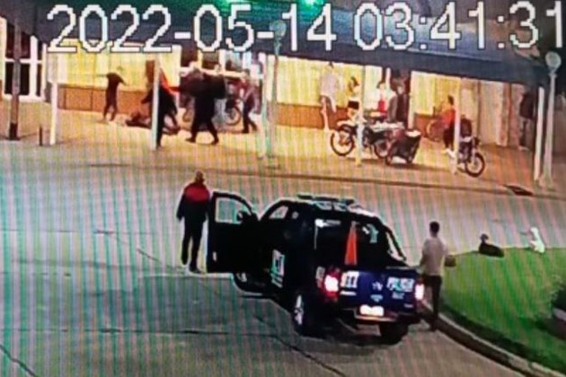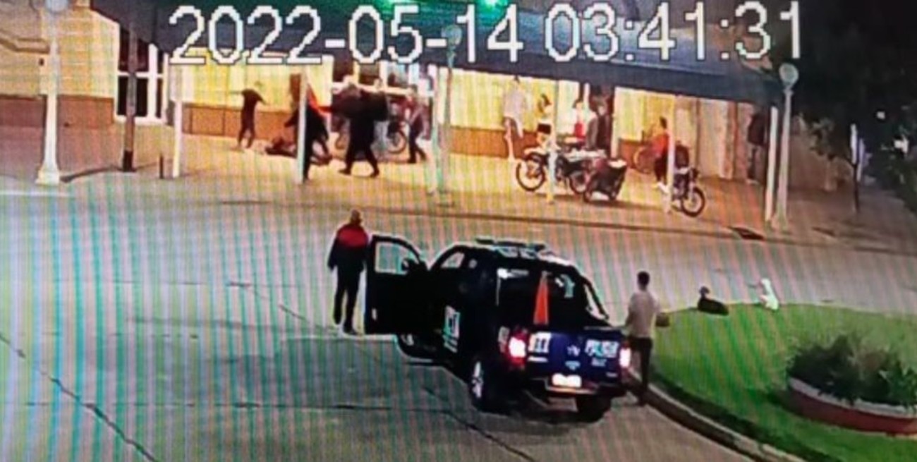 Una cámara de la Municipalidad de Sastre que toma el frente del local grabó íntegramente la secuencia desarrollada en la vía pública, cuando un muchacho de remera clara sale a los empujones de la entrada principal del pub Gaviota y corre en busca de protección de un móvil policial que estaba estacionado en la vereda de enfrente.