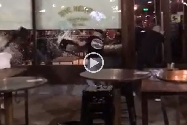 Las imágenes son impactantes y muestran a varios hombres golpeando y rompiendo los vidrios de las ventanas con sillas, ante la mirada de los empleados del bar ubicado en pleno centro de La Plata y de la gente que se encontraba en el lugar, sorprendida por el hecho.