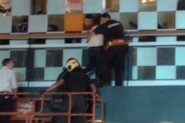 Las imágenes fueron obtenidas por las personas que se encontraban en ese momento en el sector del patio de comidas y zona de juegos infantiles. Allí se observa al chico de 23 años agarrado de la baranda y amenazando con tirarse.