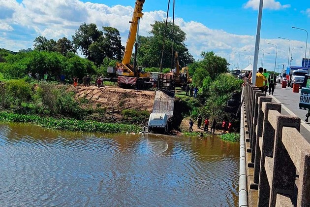 Cabe recordar que en la madrugada del miércoles, el vehículo de carga impactó contra la baranda y precipitó al agua.