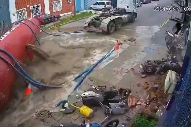 Al tumbar el acoplado, el tanque comenzó a despedir el líquido servido e inundó la calle.