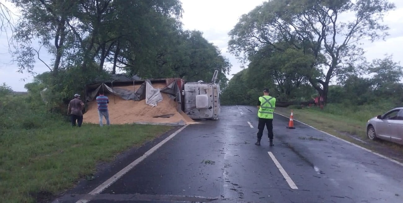 Producto del incidente con vuelco incluído, el tránsito quedó reducido en media calzada, con el rodado pesado y parte de su cargamento sobre el pavimento.