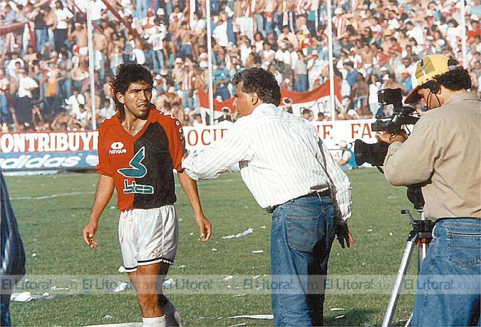 8 / 21 El clásico de la piedra. Así se lo recordará eternamente. Fue el 11 de abril de 1999 en el Centenario. El partido estaba igualado hasta que cayó un proyectil desde la tribuna sabalera, que impactó en el línea Barrientos. En la foto, se retira de la cancha acompañado por los doctores Vega y Battaglia. Foto: Archivo El Litoral
