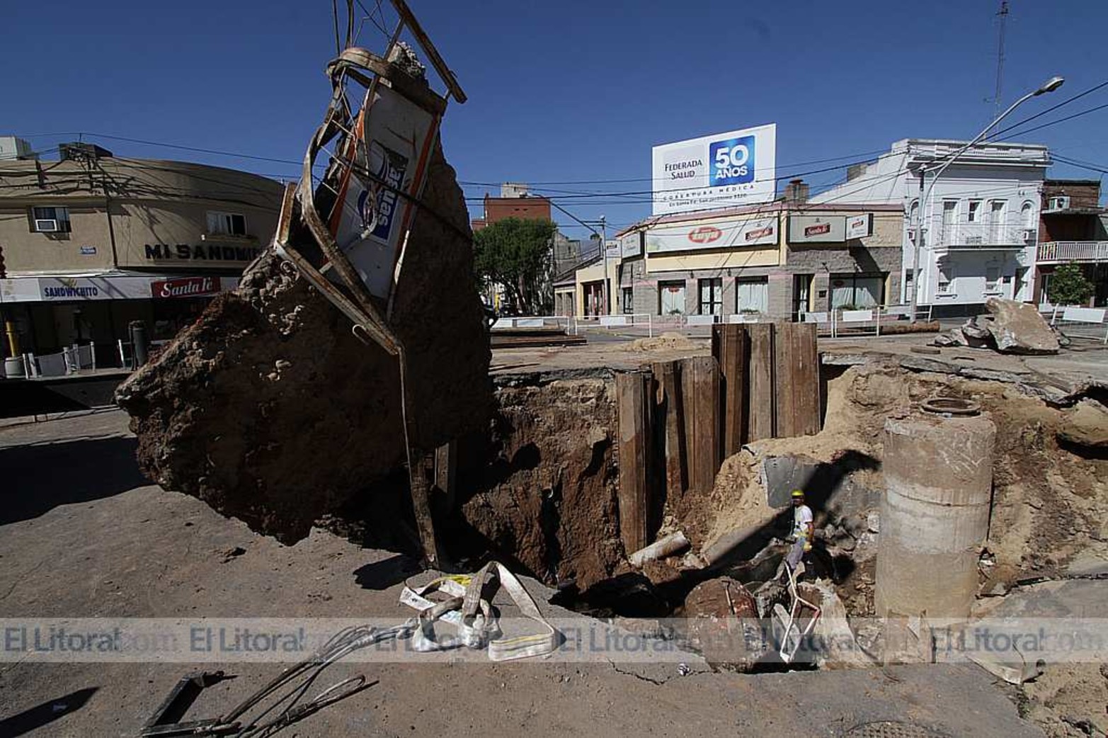 9 / 16 Segunda etapa del socavón. Por Pellegrini entre Urquiza y 4 de Enero, Agua Santafesina debió hacer un segundo bay pass sobre la cloaca madre Foto: Mauricio Garín