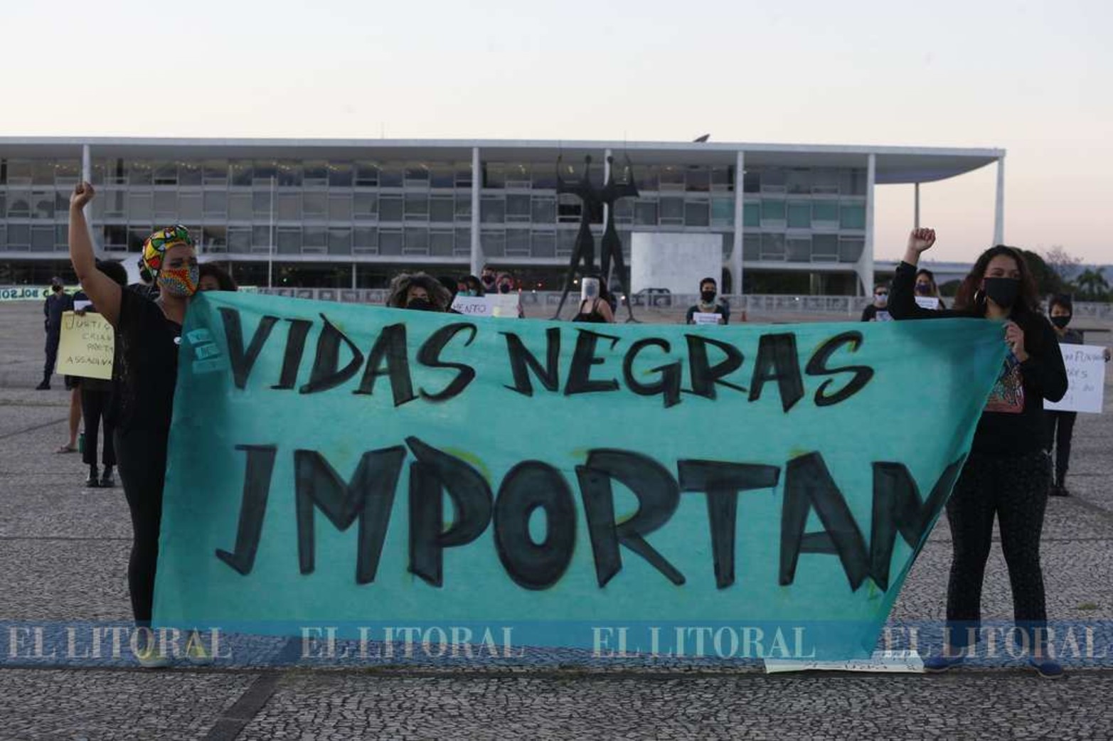 2 / 8 En Brasilia...Activistas del movimiento negro sostienen una pancarta durante una protesta contra de la violencia y los prejuicios raciales. Foto: Xinhua/Lucio Tavora