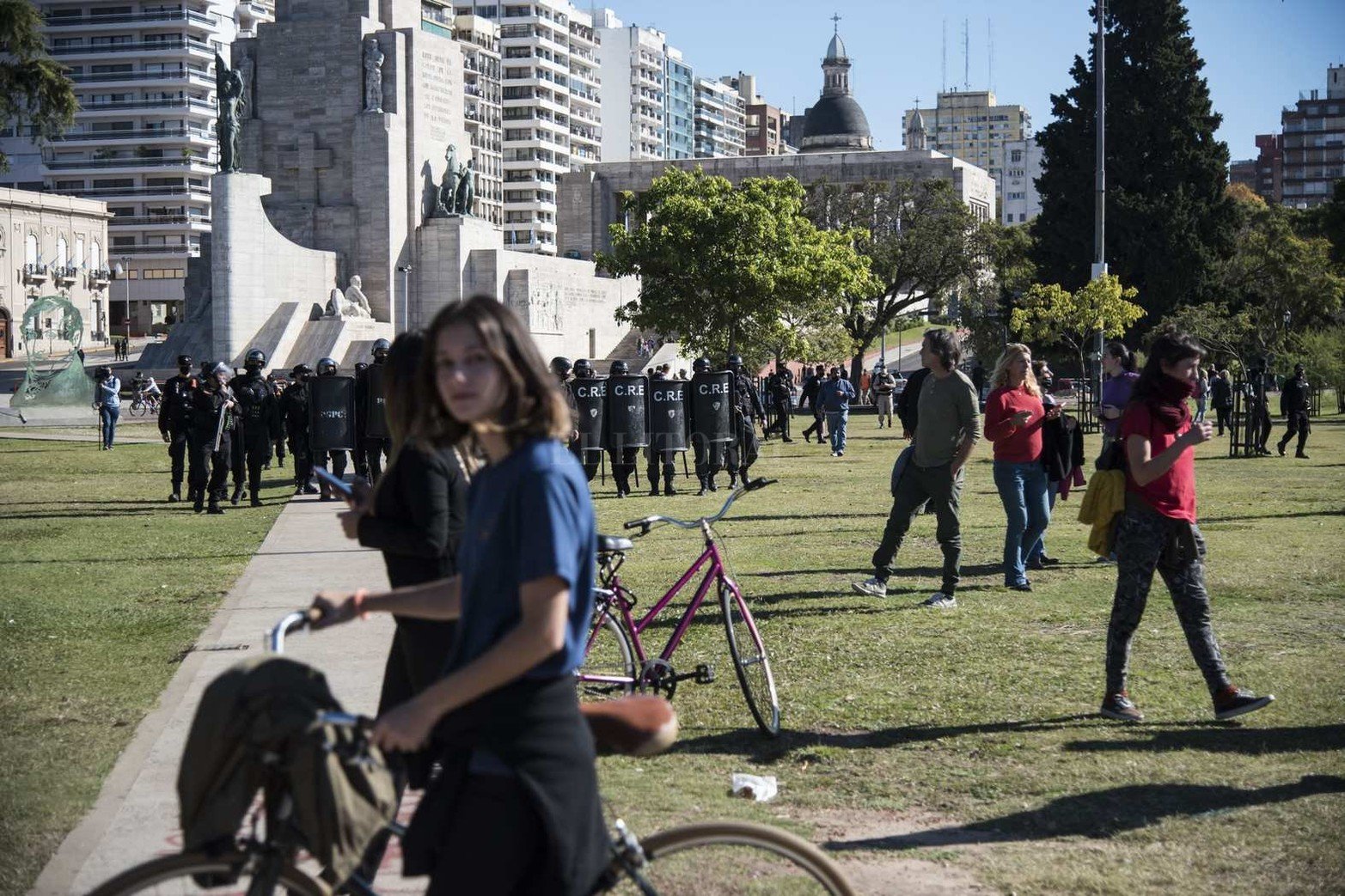 10 / 29 Un grupo numeroso de personas se manifestó en la zona del Monumento en contra de las medidas de aislamiento social que rigen hasta el 30 de junio. La Policía de la Provincia logró despejar la zona y se llevó detenidas a una veintena de personas. Foto: Marcelo Manera
