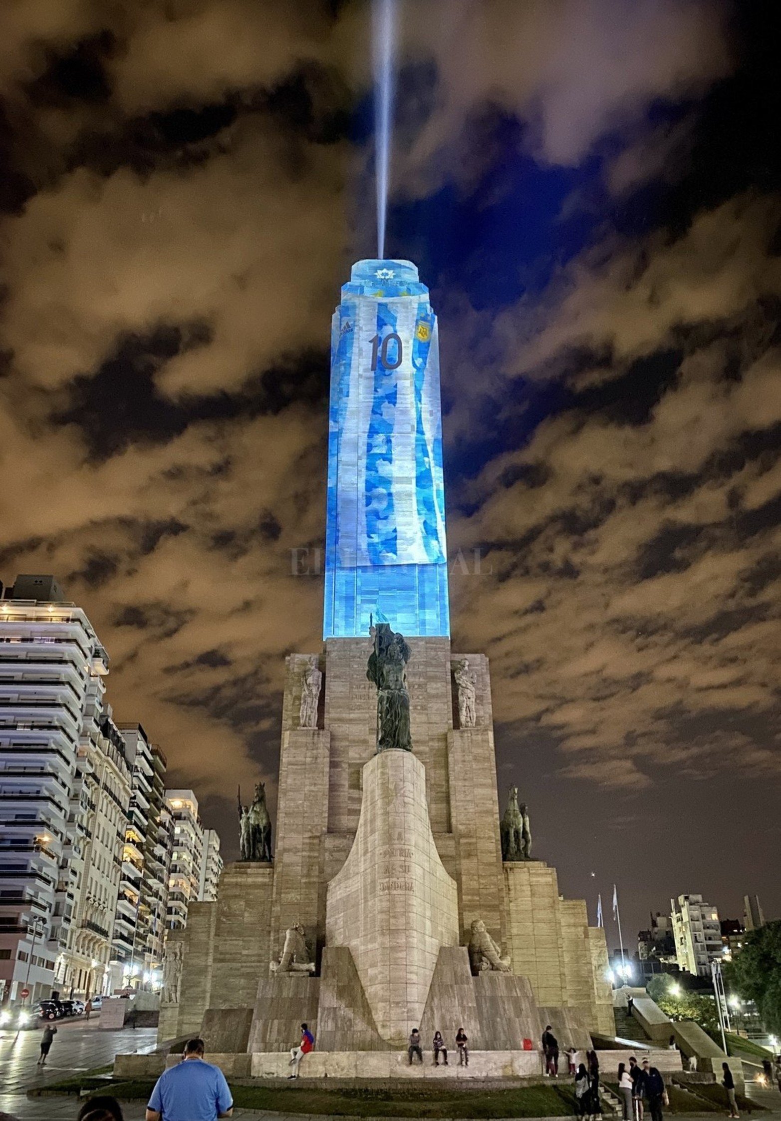 1 / 8 El Monumento a la Bandera de Rosario, ciudad natal de Lionel Messi, se iluminó este viernes por la noche con los colores celeste y blanco y fue soporte de un video mapping. Foto: Marcelo Manera