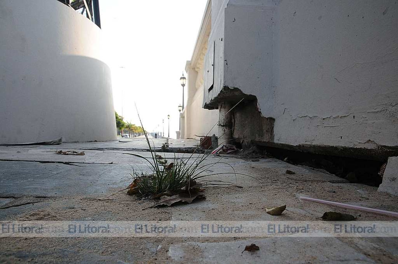 7 / 8 Larga grieta. Esta fisura se prolonga a lo largo de la baranda, a la que también le faltan columnas en algunos tramos. Foto: Flavio Raina